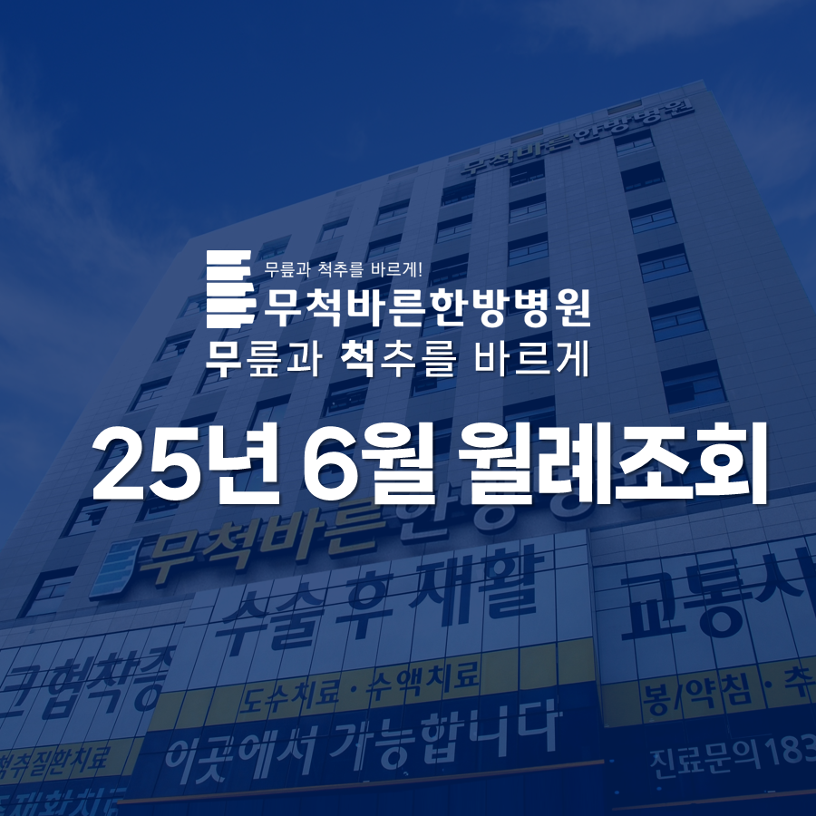 무척바른한방병원은 앞으로도 '작은 인사 한마디'의 진심이 환자분들께 전달될 수 있도록 모든 직원이 최선을 다할것이며, 늘 환자 중심의 진료와 쾌적한 치료 환경을 제공하기 위해 한 분 한 분을 정성스럽게 돌보는 병원, 무척바른한방병원이 되겠습니다.