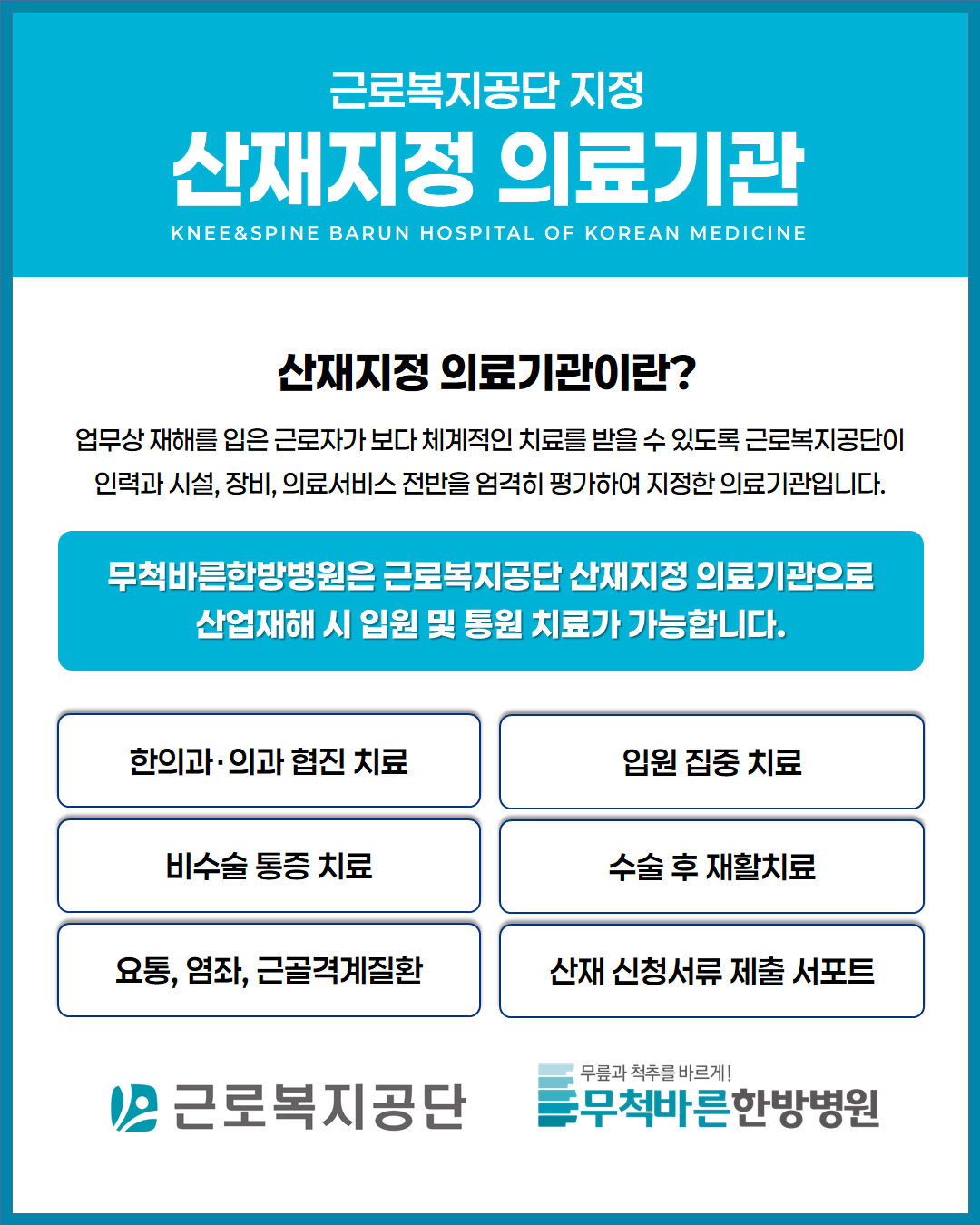 "무릎과 척추를 바르게! 근로자의 건강을 지키는 든든한 동반자, 무척바른한방병원이 함께 하겠습니다."